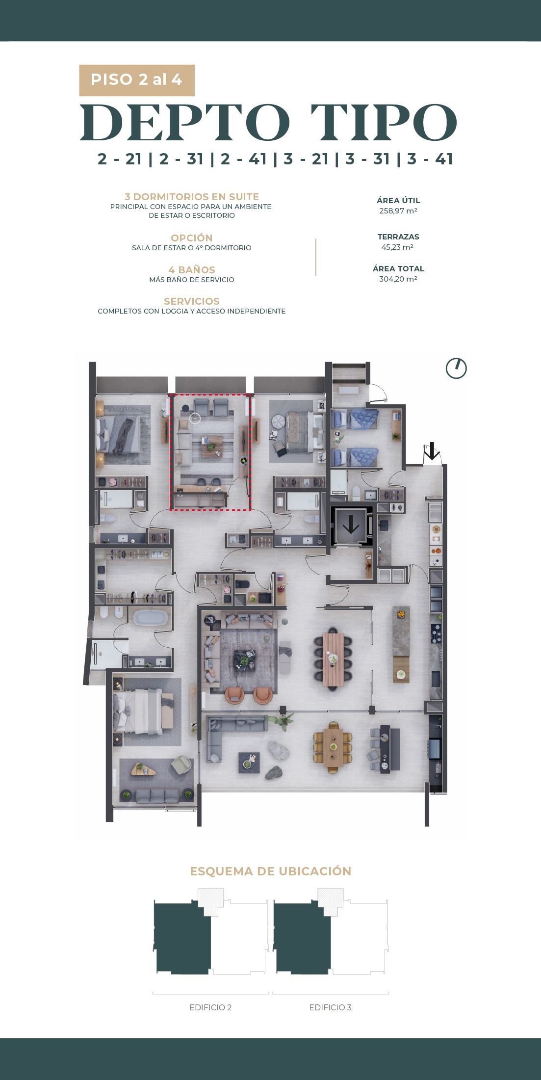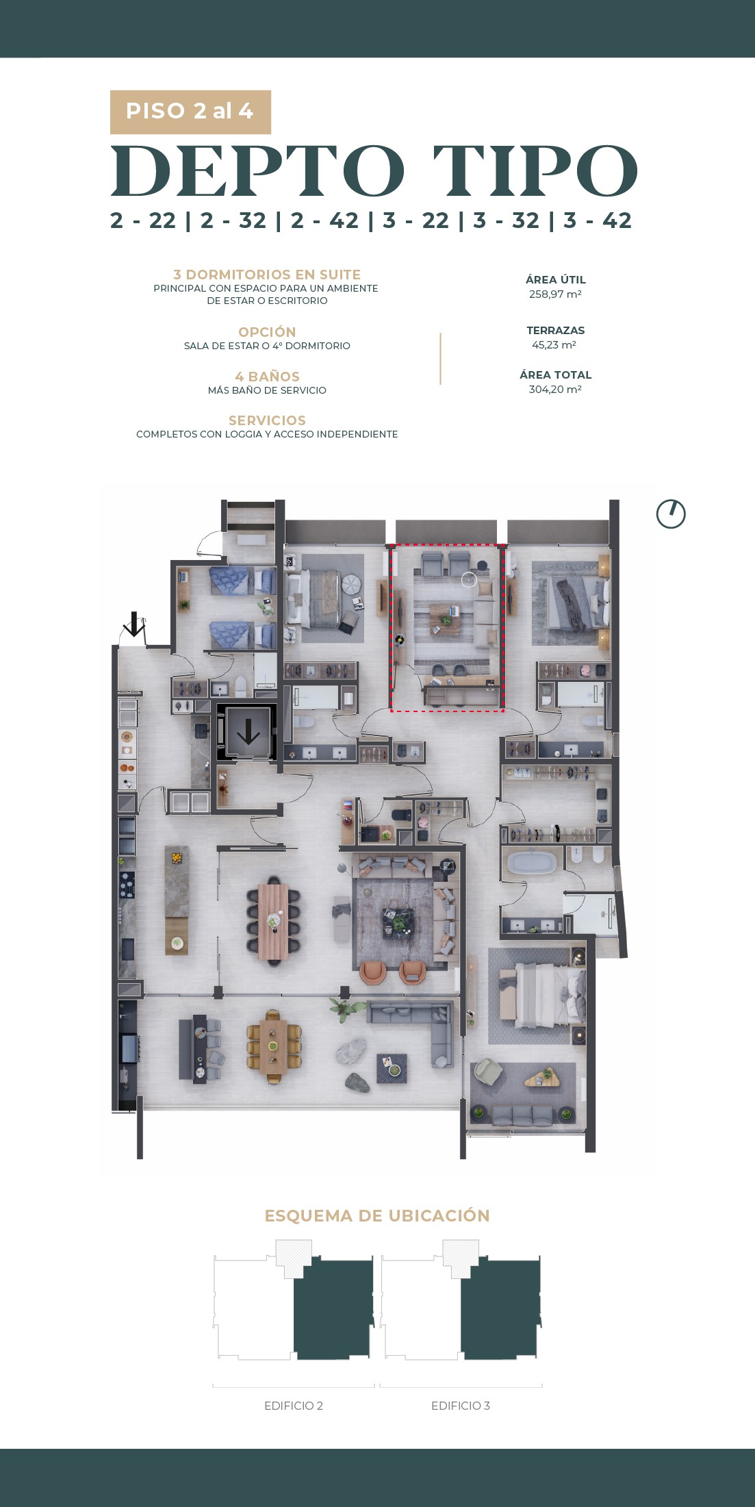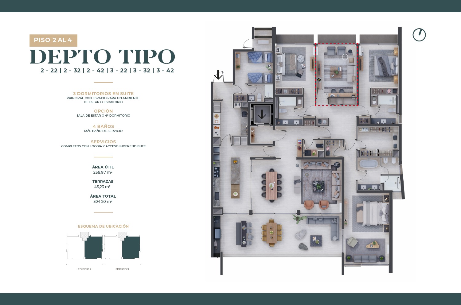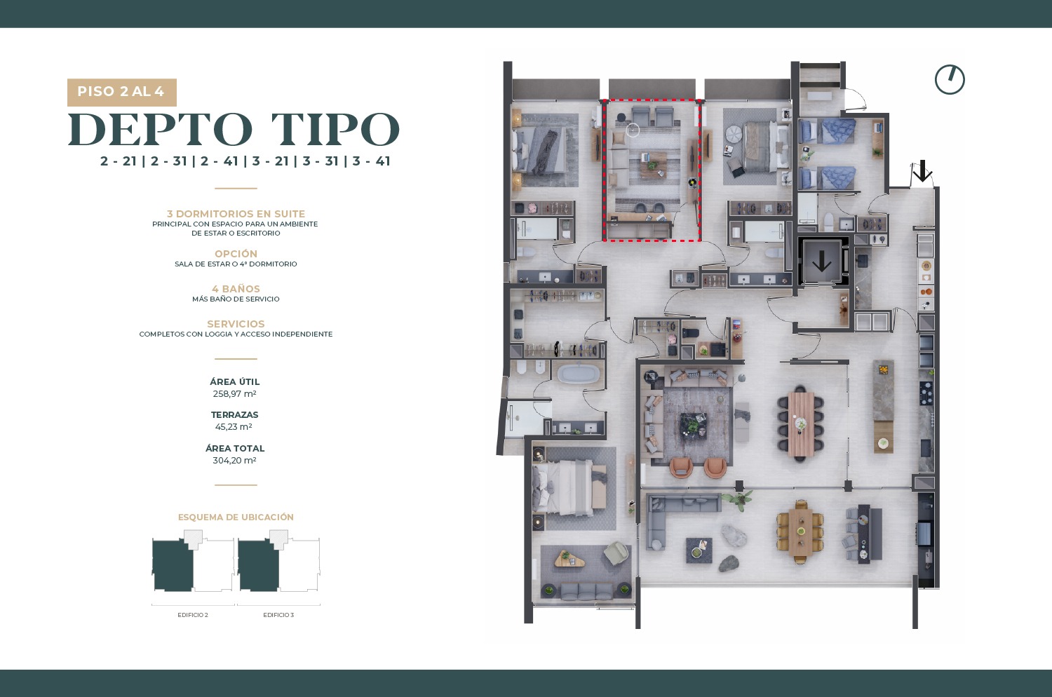 Departamentos de 2 a 4 dormitorios, en todas las unidades puedes elegir entre sala de estar o dormitorio