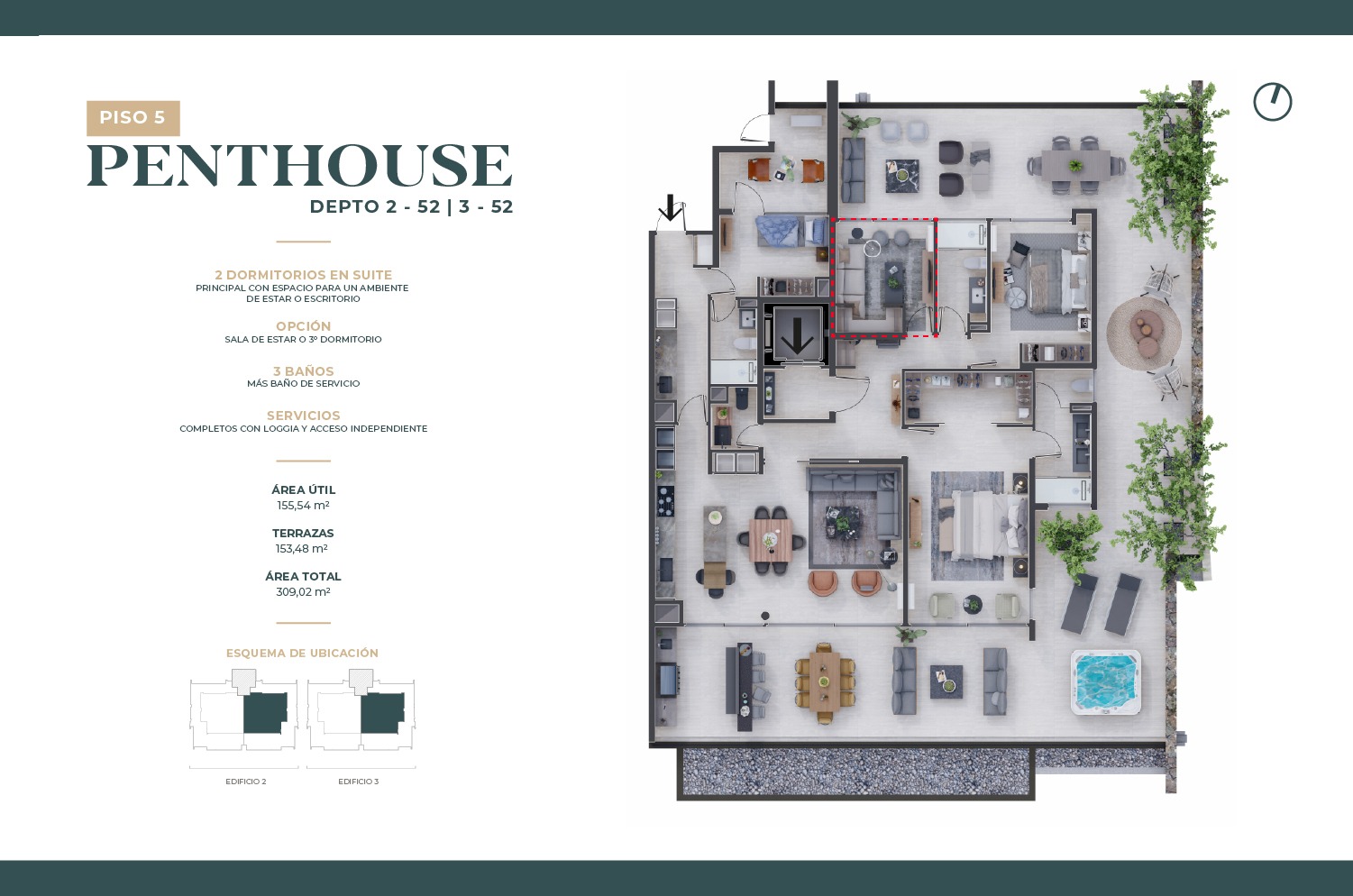 Penthouses exclusivos con amplias terrazas despejadas que ofrecen vistas incomparables de todo Santiago. Cuentan con quincho y jacuzzi, creando el espacio perfecto para disfrutar de reuniones sociales en un entorno único y sofisticado.
