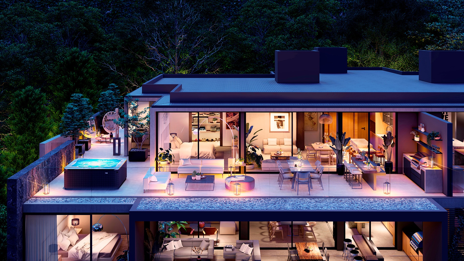La sucesión de volúmenes insertos naturalmente en el cerro aseguran una vista increíble en los 5 pisos. Espacios que otorgan privacidad y calidad de vida.
