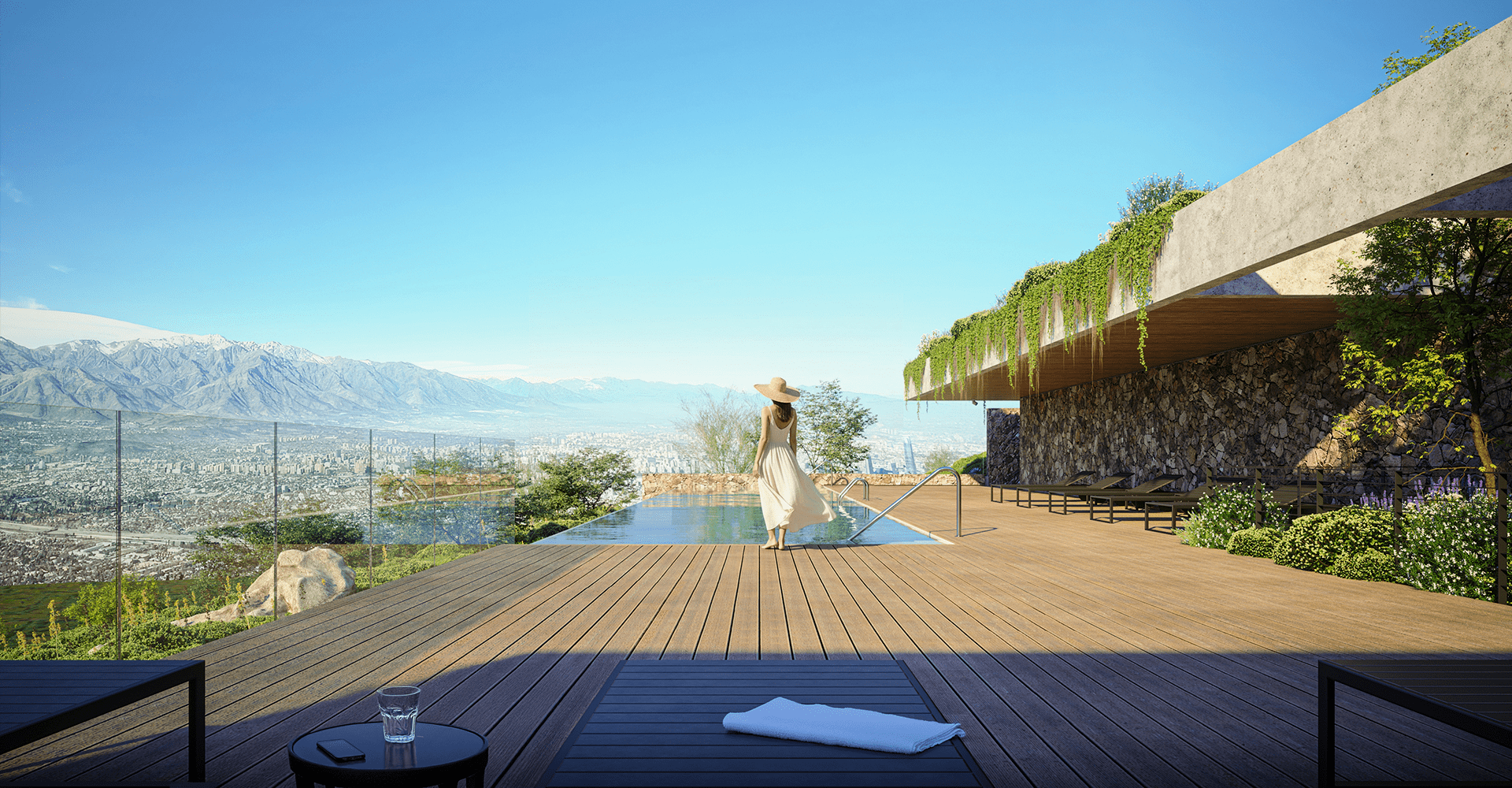 Un espejo de agua suspendido en altura, desde donde Santiago se despliega en 180 grados. Relájate con una vista ininterrumpida de la ciudad y la cordillera, en un espacio diseñado para desconectarte del mundo… y reconectar contigo.