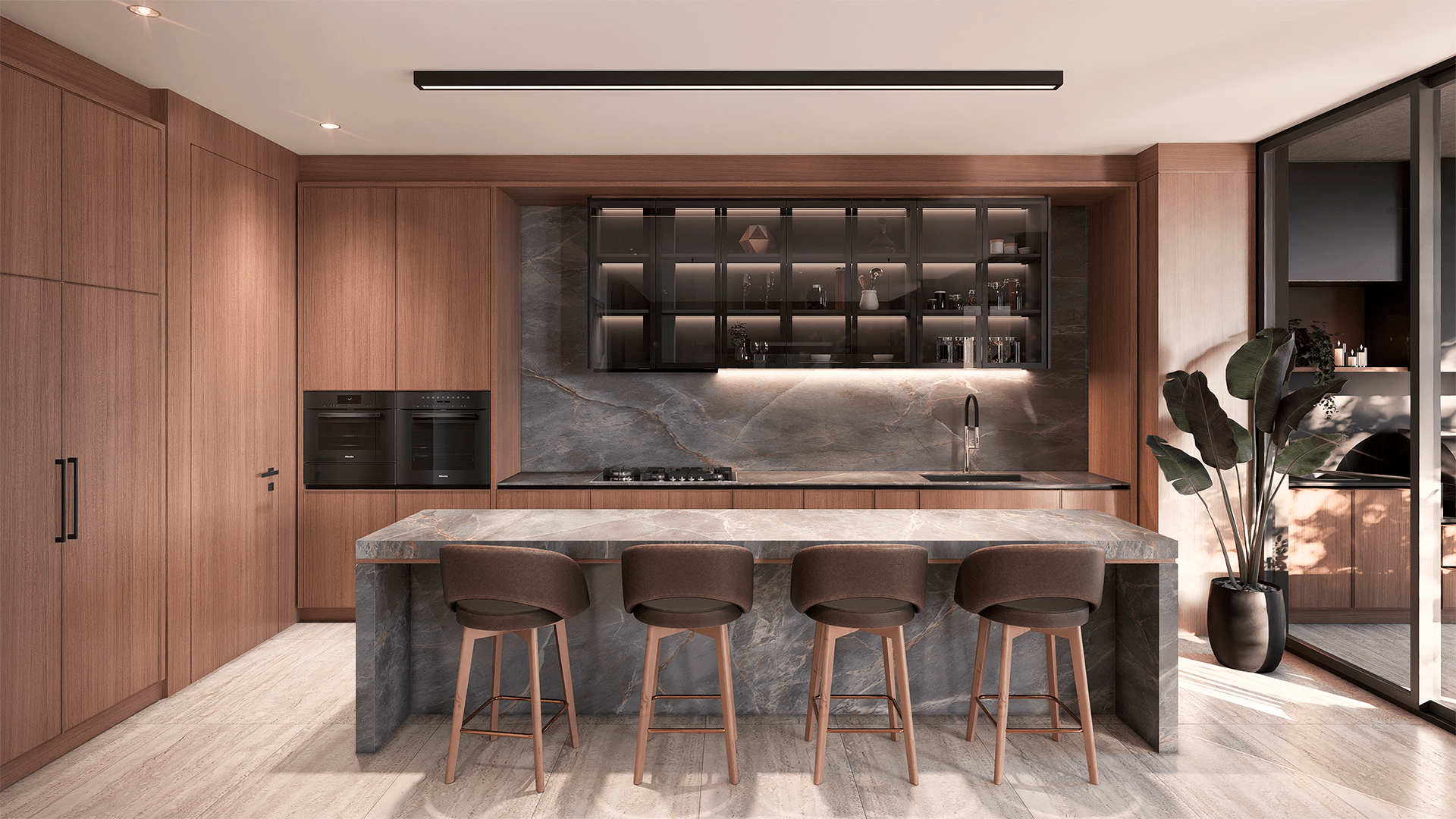 Conectada de manera simple y orgánica con el living y comedor, otorgando continuidad visual, elegancia y amplitud al espacio. Muebles en laminato, diseñados por Bontempo con artefactos integrados y apanelados.